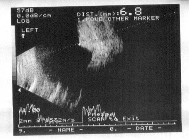 B-scan ultrasound shoed the lesion to be solid, with a height of 6.8mm and had low internal reflectivity.