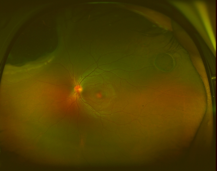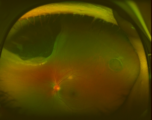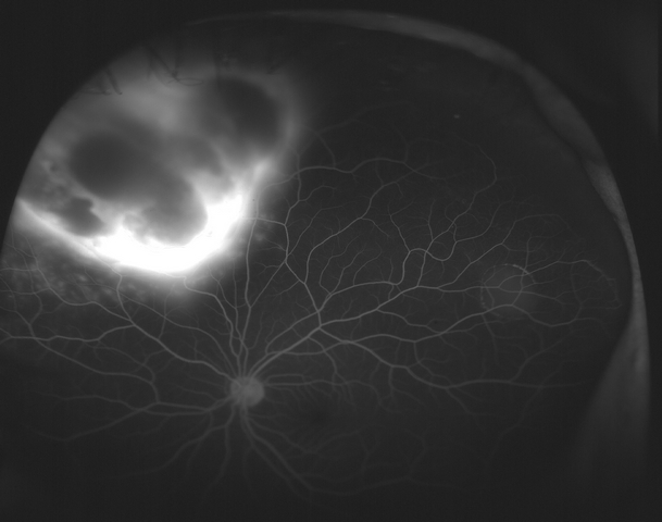 Optos fundus photographs and fluorescein angiogram were performed. The angiogram showed early blockage with some mottled hyperfluorescence that increases in the later phase, with diffuse late leakage overlying the tumor.
