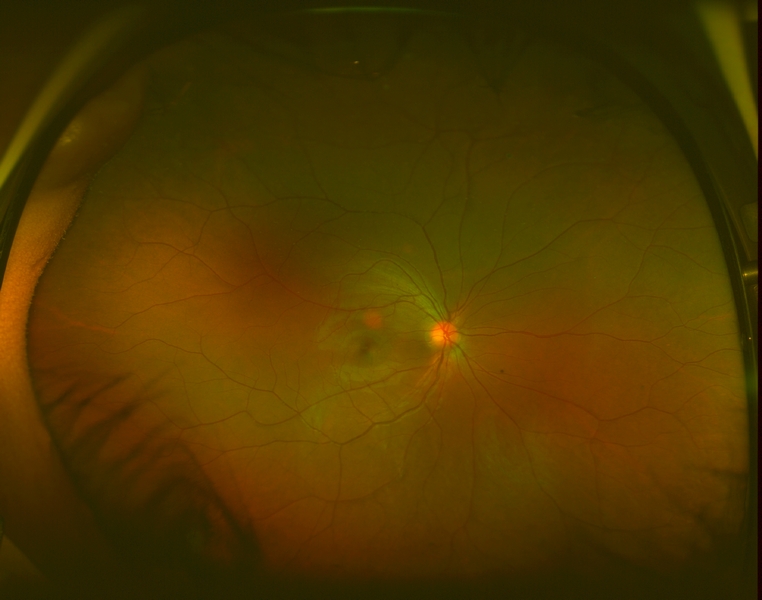 On exam, her visual acuity was 20/20 OD and 20/25 OS uncorrected. Intraocular pressures measured 16mmHg OU. Her external and anterior segment exam were unremarkable, with no evidence of inflammation. The posterior segment exam in the right eye was also unremarkable, with normal-appearing vitreous, optic nerve, macula, retinal vessels, and periphery. Examination of the left eye showed normal vitreous with no cells, normal optic nerve, and macula. In the supratemporal mid-periphery was a flat ~3 disc area CHRPE. In the supranasal periphery there was an irregular, elevated choroidal mass which involved 2 clock hours, which did not appear to extend anterior to the pars plana. The posterior aspect is anterior to the equator. The lesion was pigmented and there was trace hemorrhage overlying it. There was shallow subretinal fluid over the lesion and mild lipid exudation on its border.